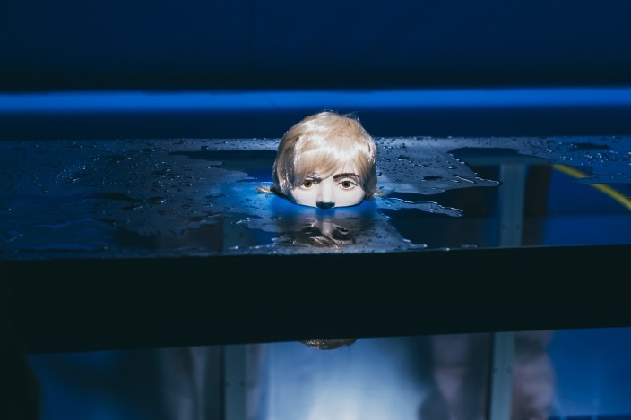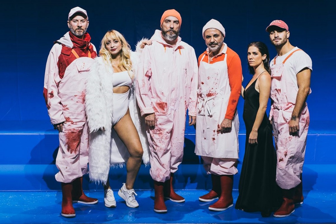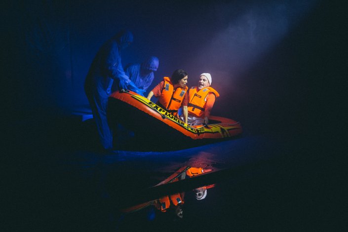 Si la obra late, y sigue latiendo hasta el final, es por su hipnótica escenografía. El agua como protagonista y el color azul cubriéndolo todo. Los azules que contrastan, a la perfección, con los naranjas de los chalecos salvavidas, de las zodiacs. Todo parece salido de una película de Wes Anderson, (a la que le añadiésemos una buena dosis de desesperanza). Marta Pazos escoge con sabiduría y elige qué discurso de imágenes puede ser el más evocador, el que mejor vista la propuesta, resolviendo con acierto. También es verdad que la escenografía tiene algo de constreñido al forzar a observar un escenario que no es cambiante, inamovible, porque el agua no se puede desalojar de escena hasta que baje el telón. Pese a todo, hace que las acciones fluyan y posean belleza, crudeza, lirismo, épica. Las mejores escenas: la de las cabezas de los y las niñas ahogados o la de la niña con cara de muñeca (que interpreta Blasco) sobre la zodiac.