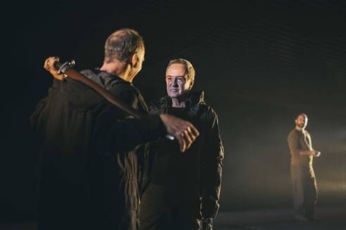Carlos Hipólito se blinda en un papel que es un regalo, como texto, como personaje, pese a que echamos en falta un emocionario más amplio en su personaje que lo lleve más allá. Tal vez tenga que ver con que el desgarro interno no se refleja del todo por fuera y hay alta concentración de mesura. El papel de Lady Macbeth, en manos de Marta Poveda, a veces se sostiene y apuntala sobre una forma de decir y unos aspavientos un tanto histérico-cómicos que no nos dejan encontrar en ella un personaje más envenenado, más tóxico, más próspero en matices de alimaña astuta. Nos convence Banquo que encarna, aquí, el actor Jorge Kent. Su muestrario de voz, gestos y presencia es, sin duda, más que solvente. Eso sí, en su caracterización de médico, el resultado no es el mismo dado que la presencia de su personaje parece extemporáneo dentro del conjunto.