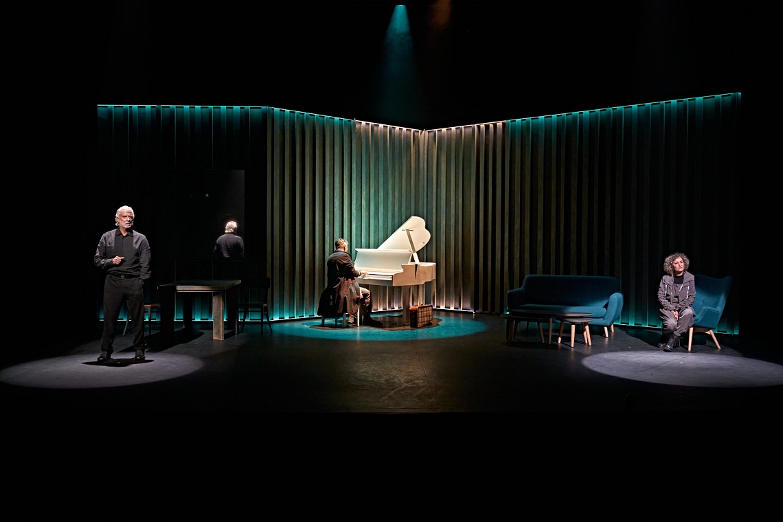 La puesta en escena es sencilla pero efectiva. De un lado, una mesa y dos sillas en la oscura sala de interrogatorios; del otro, el salón luminoso de la casa de Elena y su amigo Kristof, con un imponente piano blanco. Todo unido por una estructura a modo de pared de líneas verticales que funciona como férreo muro herrumbrado y como pantalla de proyección (es, quizás, ¿la cortina de hierro que parece que aún está dividiendo Europa y los países del Este?).