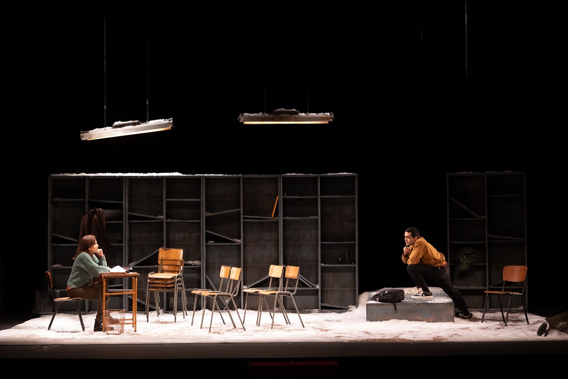 Cuando apuntamos a que la literatura abunda en la pieza de Rapp es por varios motivos: por un lado, el autor parece querer contarle al público cuáles son sus autores o autoras predilectos/as y tira de corolario de nombres interesantes. Como anécdota, en la versión original (recordemos que esta es una versión de Rubio, que a la vez la dirige), el personaje del alumno está escribiendo una novela y cuenta que su novela comienza con el viaje de un chico a ver una obra de teatro a la ciudad: en la versión original una obra de Carol Churchill (elegida por Rapp) y en la versión de Juan Carlos Rubio, una de Mayorga. Por otro lado, la literatura está presente en los protagonistas: ella es una profesora universitaria de escritura y él, el alumno, un escritor primerizo. Ella ha publicado varios libros de éxito, pero, con el paso de los años, la industria y la critica parecen haberla relegado a una esquina del tablero. De hecho, a modo de ejercicio metaliterario, el joven alumno y la profesora hablan de uno de los libros de ella y desgranan la historia que este relataba (sobre un chico que decía que podía atravesar los muros).